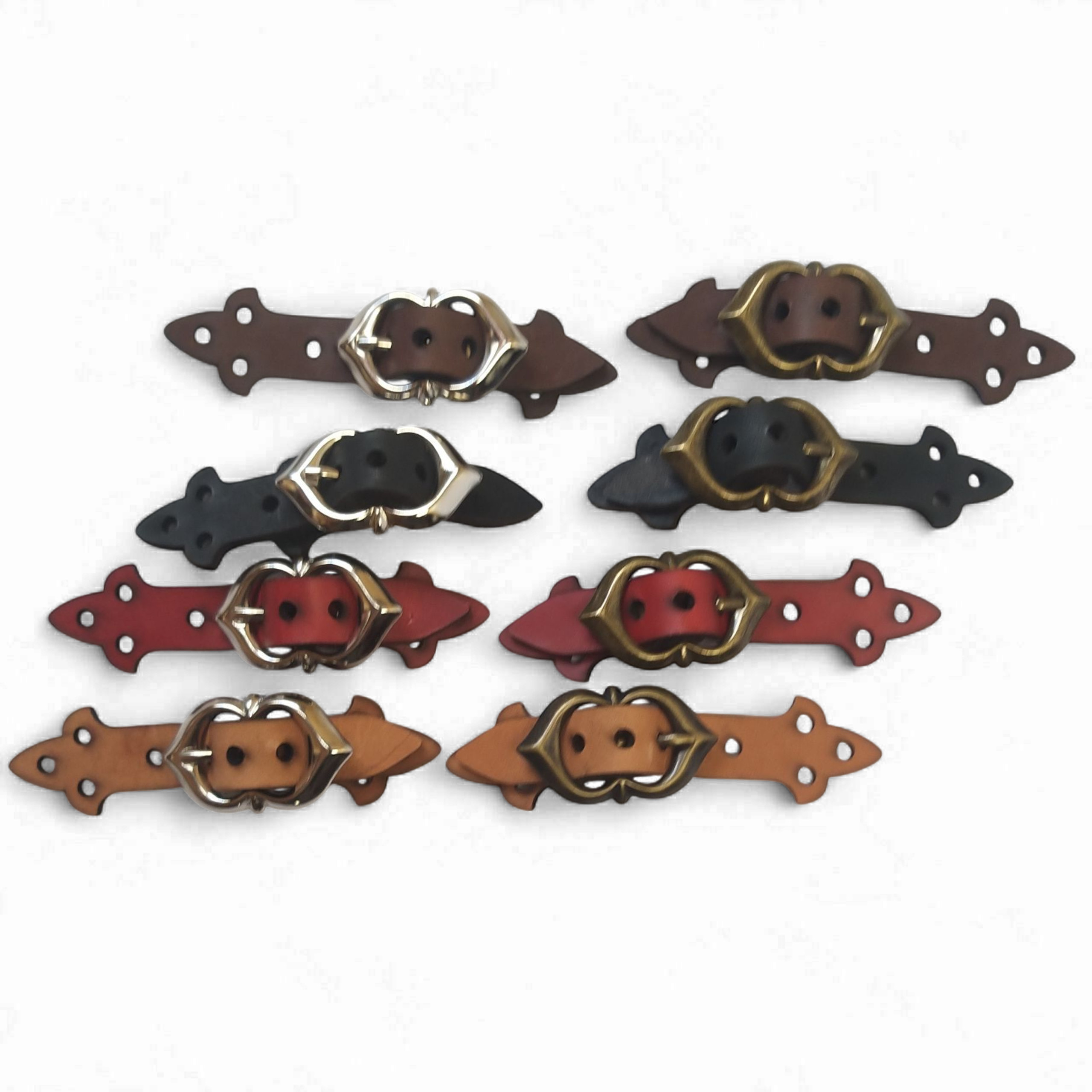 Diese fertig montierten Schnallensätze können leicht auf Rüstungsteile, Taschen oder Kleidungsstücke aufgenietet werden. Wenn das mittlere Loch benutzt wird, sind sie 10cm lang, ansonsten zwischen 9 cm und 12 cm verstellbar.  Der Riemen ist 14mm breit und bestehen aus 2,5 mm starken Rindleder in vielen Farben. Für diesen Schnallensatz verwenden wir die Schnalle "Spätmittelalter" (Art. Nr. GuSch 2010).