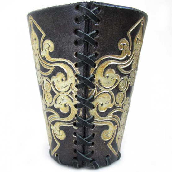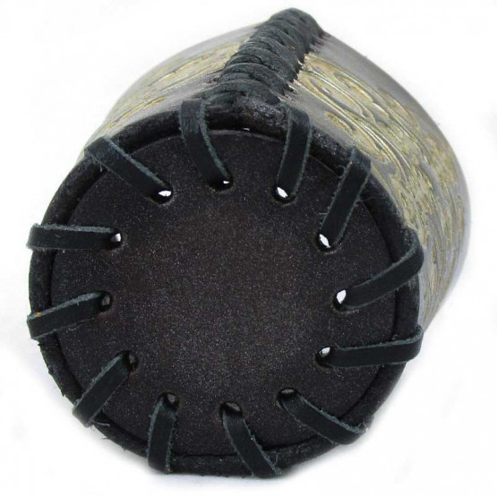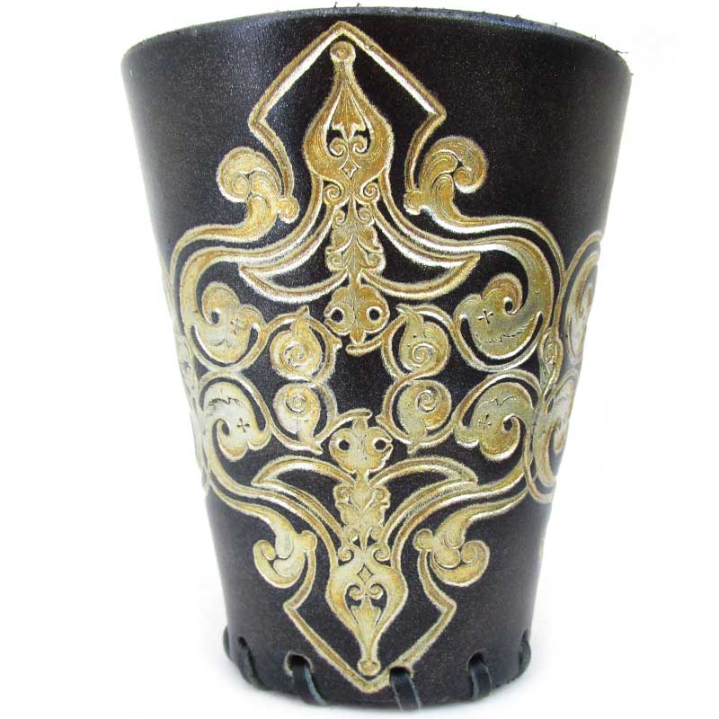 Sie erhalten einen verzierten, handgemachten Würfelbecher aus echtem Leder der jedem Spieltisch etwas individuelles und magisches verleiht.